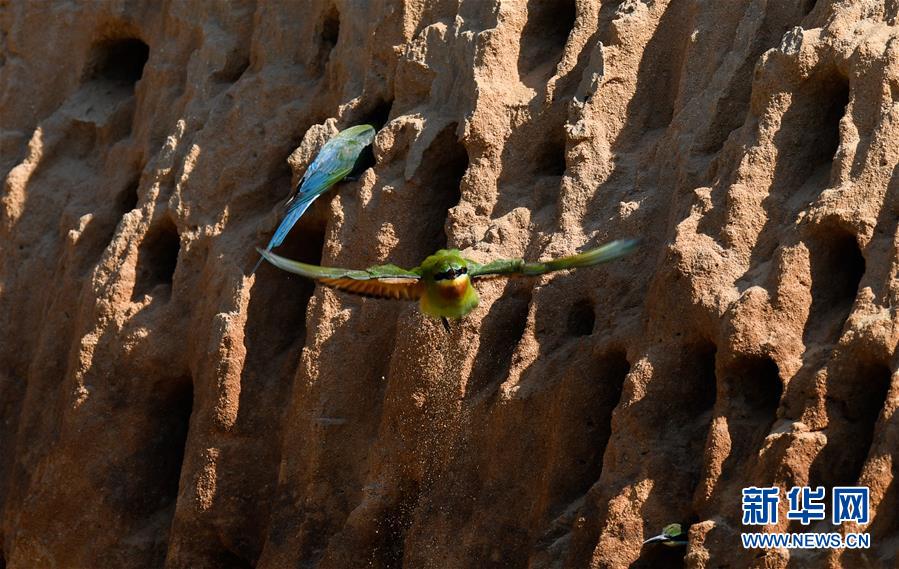 在海口五源河下游蜂虎保護(hù)小區(qū),栗喉蜂虎在沙質(zhì)土坡上起飛(5月7日攝)。新華社記者楊冠宇攝