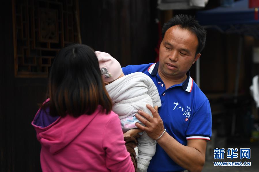 施六金(右)從妻子手中接過兒子施澤恩(4月25日攝)。1973年出生于十八洞村的施六金,由于父親患病很早就放棄學(xué)業(yè)和母親扛起了家庭的重?fù)?dān)。為了生活,他還曾遠(yuǎn)去東南亞打工。2015年,看到家鄉(xiāng)的變化,施六金回到村里開起了農(nóng)家樂,年度家庭人均純收入也從2014年的1715元增長到了2019年的35696元。2018年,施六金與心愛的人組建了家庭。今年初,施六金與愛人迎來了一個大胖小子?!白鋈俗鍪乱没貓蠛透卸??!笔┝鸾o剛出生的兒子取名施澤恩。新華社記者薛宇舸攝