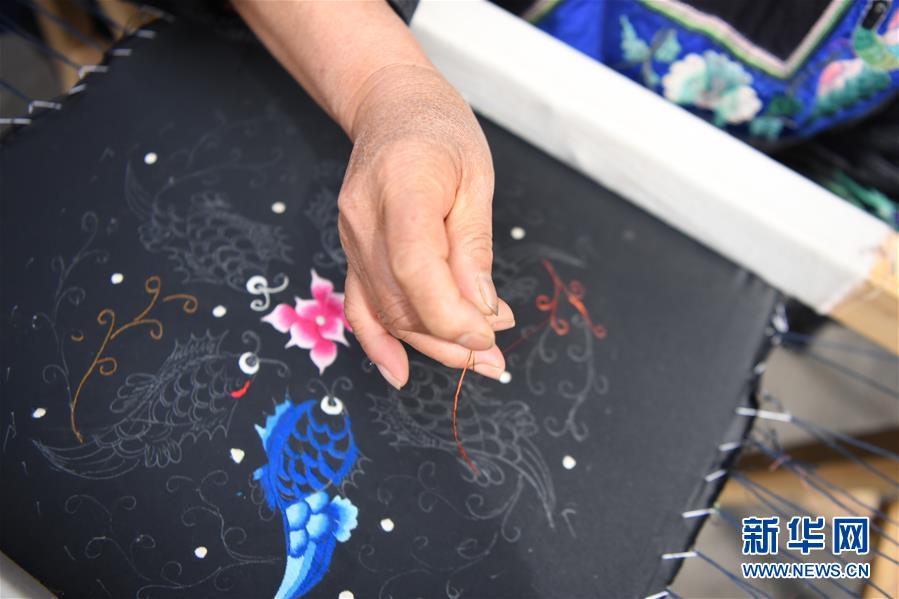 吳美金在十八洞村苗繡特產(chǎn)農(nóng)民專業(yè)合作社繡苗繡(4月24日攝)。1967年出生的吳美金,1992年嫁入飛蟲村(現(xiàn)十八洞村飛蟲寨)時(shí),只有爛泥路的飛蟲村不僅田土少,掙錢活路也少,生活十分困難。2014年,吳美金加入了十八洞村苗繡特產(chǎn)農(nóng)民專業(yè)合作社,從小就會的苗繡傳統(tǒng)手藝如今成了家庭增收的法寶,不僅在家門口就把錢掙了,同時(shí)還能照顧年幼的孫子孫女。“現(xiàn)在的日子,比年輕的時(shí)候好多了?!眳敲澜鹫f。新華社記者薛宇舸攝