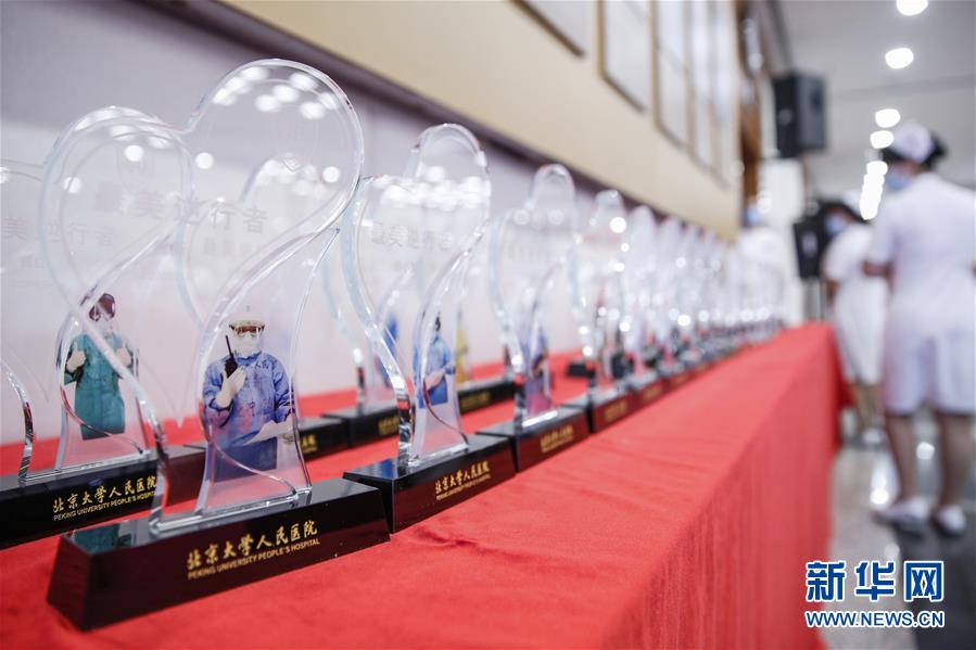 5月11日,工作人員整理印有援鄂隊(duì)員工作照的獎(jiǎng)杯。在國際護(hù)士節(jié)到來之際,北京大學(xué)人民醫(yī)院11日舉辦慶祝護(hù)士節(jié)暨優(yōu)秀集體和個(gè)人表彰活動,并邀請?jiān)踽t(yī)療隊(duì)護(hù)士代表分享戰(zhàn)“疫”故事。我國今年護(hù)士節(jié)的主題為“致敬護(hù)士隊(duì)伍,攜手戰(zhàn)勝疫情”。新華社記者張玉薇攝
