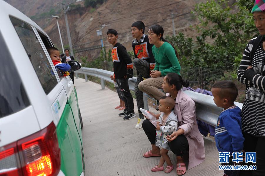 5月12日,四川省昭覺縣阿土列爾村第一批26戶貧困戶坐上開往昭覺縣易地扶貧搬遷縣城集中安置點的新家,與其他村民道別。新華社記者江宏景攝