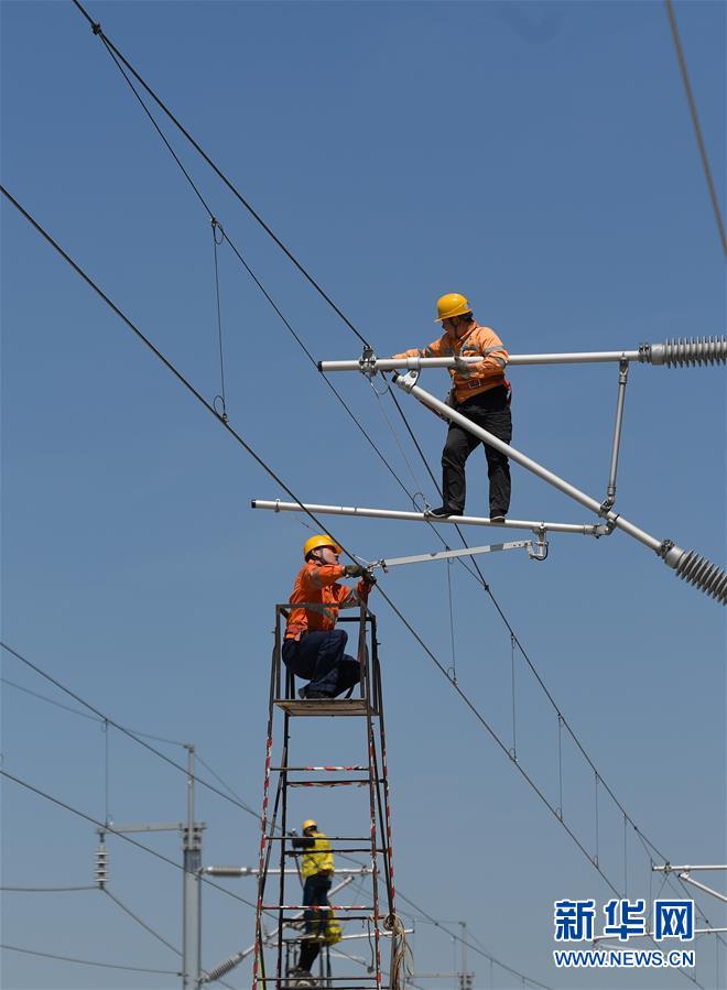 5月12日,中國鐵路上海局集團(tuán)公司上海高鐵維修段的技術(shù)人員在商合杭高鐵浙江湖州段調(diào)整接觸網(wǎng)導(dǎo)線。近日,商合杭高鐵合肥至湖州段聯(lián)調(diào)聯(lián)試正有條不紊進(jìn)行中。中國鐵路上海局集團(tuán)公司上海高鐵維修段抽調(diào)49名精兵強(qiáng)將,持續(xù)對管轄范圍內(nèi)的高鐵線路、信號、接觸網(wǎng)線進(jìn)行調(diào)試,為下一階段打下基礎(chǔ)。據(jù)了解,商合杭高鐵合湖段聯(lián)調(diào)聯(lián)試之后將轉(zhuǎn)入運(yùn)行試驗階段,驗收合格并通過安全評估后,力爭6月底具備開通運(yùn)營條件。新華社記者黃宗治攝