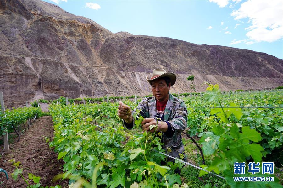 在西藏昌都市芒康縣木許鄉(xiāng)阿東村,村民在葡萄園里忙碌(5月6日攝)。新華社記者詹彥攝