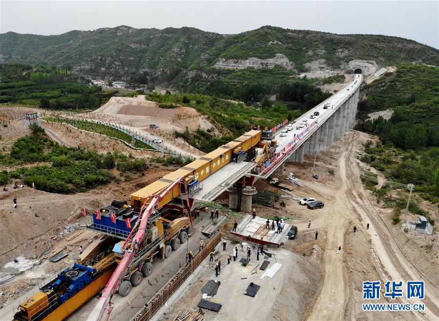 5月13日,運(yùn)架一體機(jī)在位于河南焦作的施工現(xiàn)場進(jìn)行架梁作業(yè)(無人機(jī)照片)。 當(dāng)日,隨著最后一榀長24米、重552噸的箱梁架設(shè)就位,太焦高鐵全線橋梁架設(shè)完成。從山西太原到河南焦作的太焦高鐵是國家規(guī)劃建設(shè)的“八縱八橫”高速鐵路網(wǎng)的重要組成部分,計(jì)劃2020年底建成通車。 新華社記者李安攝