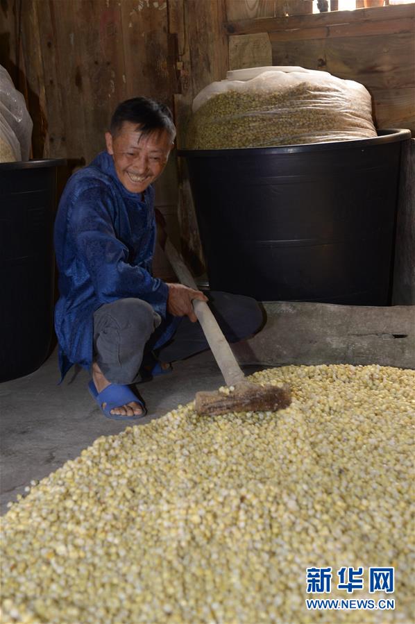 5月14日,在貴州省畢節(jié)市百里杜鵑管理區(qū)黃泥鄉(xiāng)龍?zhí)链逡患揖谱鞣?,村民?duì)玉米進(jìn)行發(fā)酵。貴州省畢節(jié)市百里杜鵑管理區(qū)黃泥鄉(xiāng)龍?zhí)链宓凝執(zhí)凉啪?,因?dú)特的古法釀酒技術(shù),口感獨(dú)特而遠(yuǎn)近聞名。全村有釀酒戶(hù)142戶(hù),年產(chǎn)量達(dá)45萬(wàn)多公斤,龍?zhí)凉啪七h(yuǎn)銷(xiāo)重慶、廣東、浙江等地,龍?zhí)凉啪埔殉蔀辇執(zhí)寥嗽鍪盏闹匾獊?lái)源。新華社記者楊楹攝