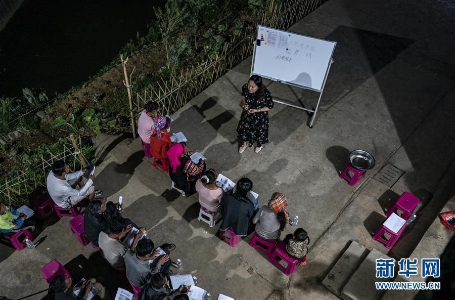 村民們利用夜間空閑時(shí)間,在院子里集體學(xué)習(xí)普通話(3月28日攝)。新華社記者江文耀攝