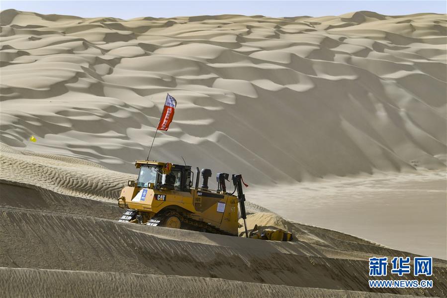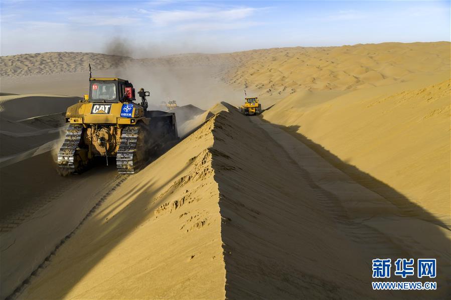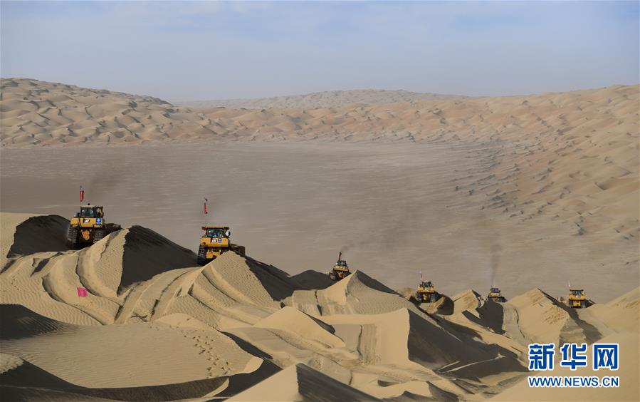 世界第二大流動沙漠——塔克拉瑪干沙漠東部腹地,風(fēng)依舊在吹。極細(xì)的沙粒隨風(fēng)飄蕩,無孔不入。新疆尉犁至且末沙漠公路施工現(xiàn)場仍是機器轟鳴,多臺大型推土機一字排開,將高聳的沙山緩緩?fù)破健?/p>