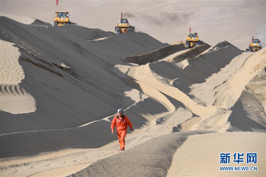 工人李明友在施工現(xiàn)場(chǎng)爬上沙丘(5月16日攝)。新華社記者宋彥樺攝