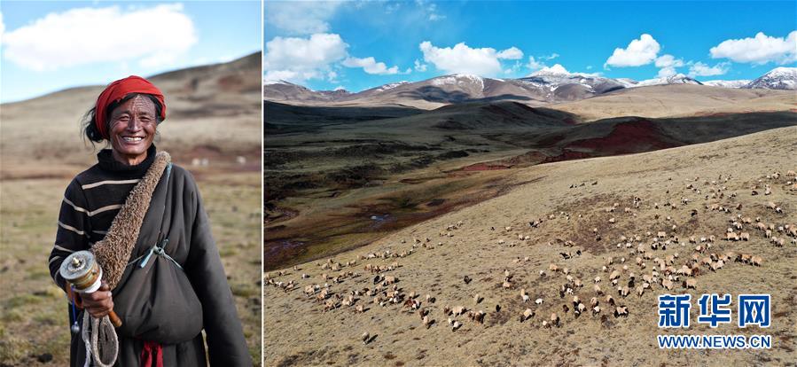 拼版照片:左圖為西藏昌都市貢覺縣拉妥鄉(xiāng)宗巴村村民多吉;右圖為在貢覺縣阿旺鄉(xiāng)牧場,多吉幫一位綿羊養(yǎng)殖大戶放牧(無人機照片)。多吉自家有20只羊和10頭牛,之前一直在村里放牧。2019年他來到阿旺鄉(xiāng)幫綿羊養(yǎng)殖大戶放牧,每月有3900元的收入(5月2日攝)。