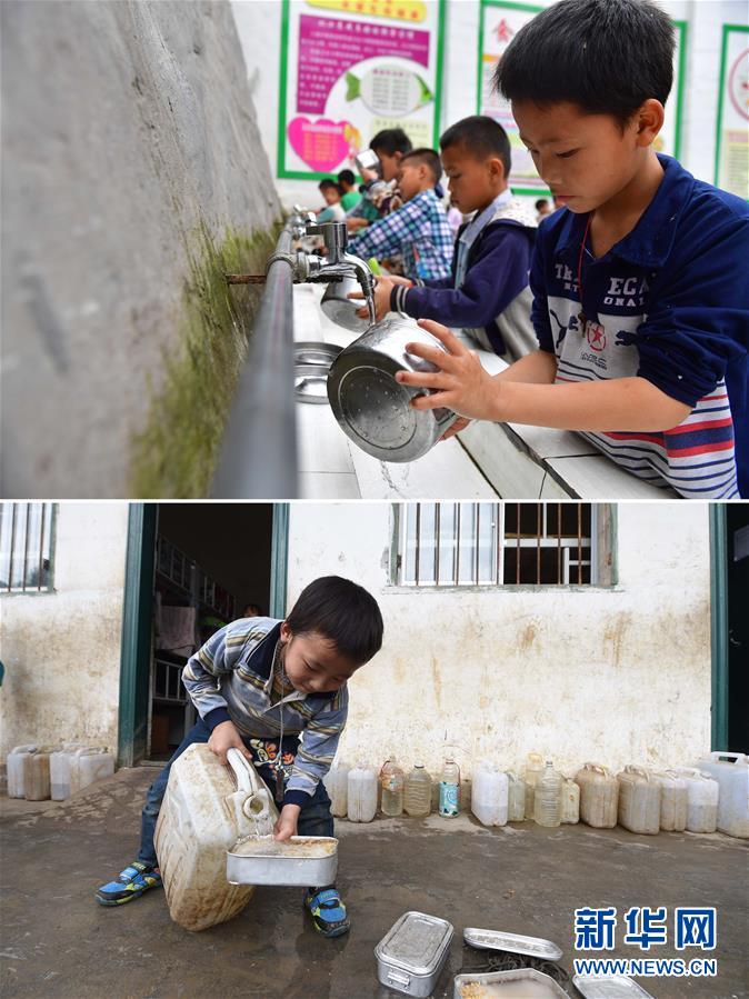 這是一張拼版照片。上圖:在大化瑤族自治縣板升鄉(xiāng)八好小學(xué),同學(xué)們在用泉水洗碗(2019年5月7日攝)。下圖:八好小學(xué)的同學(xué)們用儲(chǔ)備在水桶里的雨水淘米煮飯(2014年11月24日攝)。八好小學(xué)有400多名學(xué)生,曾僅有一個(gè)不足100立方米的水柜,用于收集儲(chǔ)存樓頂?shù)挠晁?,學(xué)生需定期定量用水。遇到長時(shí)間不下雨,學(xué)校需要到鄉(xiāng)政府所在地運(yùn)水。如今,學(xué)校修建了5個(gè)大水柜,并從兩公里外引泉水到校園,“飲水難”問題得到解決。新華社記者黃孝邦攝