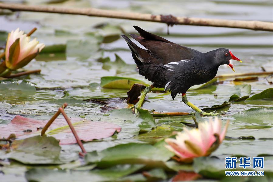 5月22日,一只紅嘴水雞在蓮葉間行走。近日,貴陽市觀山湖公園內大片盛開的蓮花吸引了不少水鳥在其間嬉戲覓食。新華社記者劉續(xù)攝