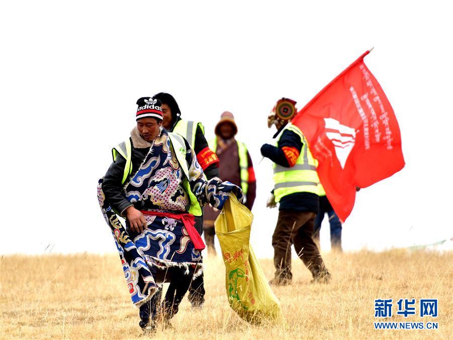 在三江源國(guó)家公園黃河源園區(qū),扎陵湖鄉(xiāng)生態(tài)保護(hù)站勒那村生態(tài)管護(hù)隊(duì)第七組的隊(duì)員在撿拾垃圾(2018年12月2日攝)。