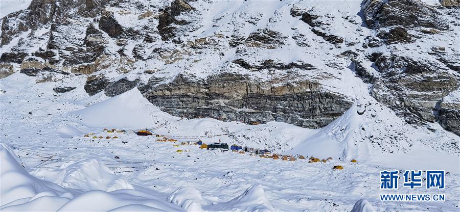 位于珠峰東絨布冰川旁海拔6500米的珠峰前進(jìn)營地(5月22日攝,無人機(jī)照片)。