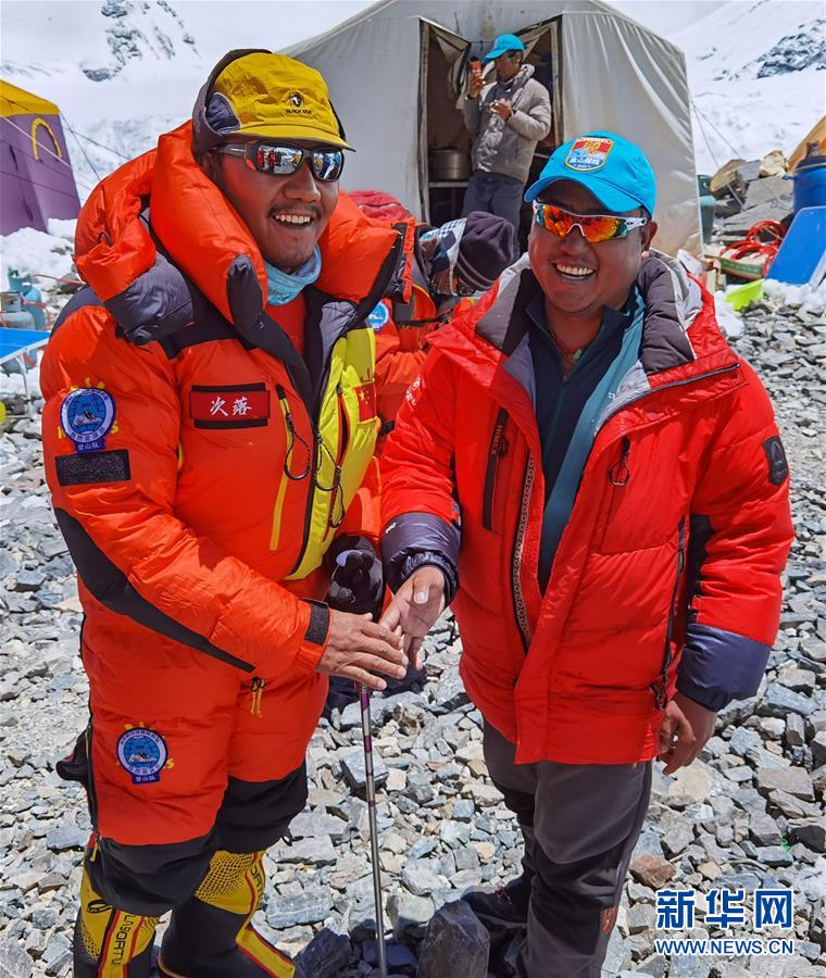 5月24日,2020珠峰高程測量登山隊副隊長桑珠(左)和沖頂組組長次落(右)在海拔6500米的前進(jìn)營地。新華社特約記者扎西次仁攝
