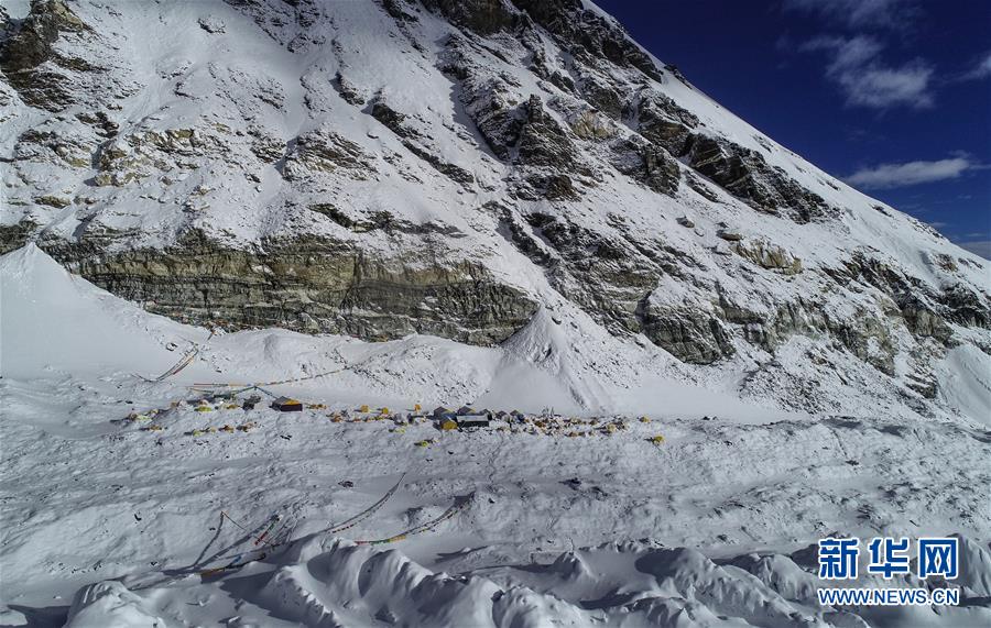 位于珠峰東絨布冰川旁海拔6500米的珠峰前進(jìn)營地(5月22日攝,無人機(jī)照片)。新華社記者晉美多吉攝