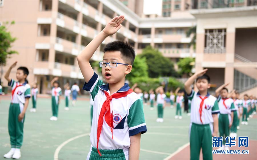 5月25日,廣州市荔灣區(qū)蔣光鼐紀(jì)念小學(xué)的學(xué)生在參加升國旗唱國歌儀式。當(dāng)日,廣州市各小學(xué)一至三年級學(xué)生正式開學(xué)復(fù)課。至此,廣州市中小學(xué)各年級已全部開學(xué)復(fù)課。新華社記者盧漢欣攝
