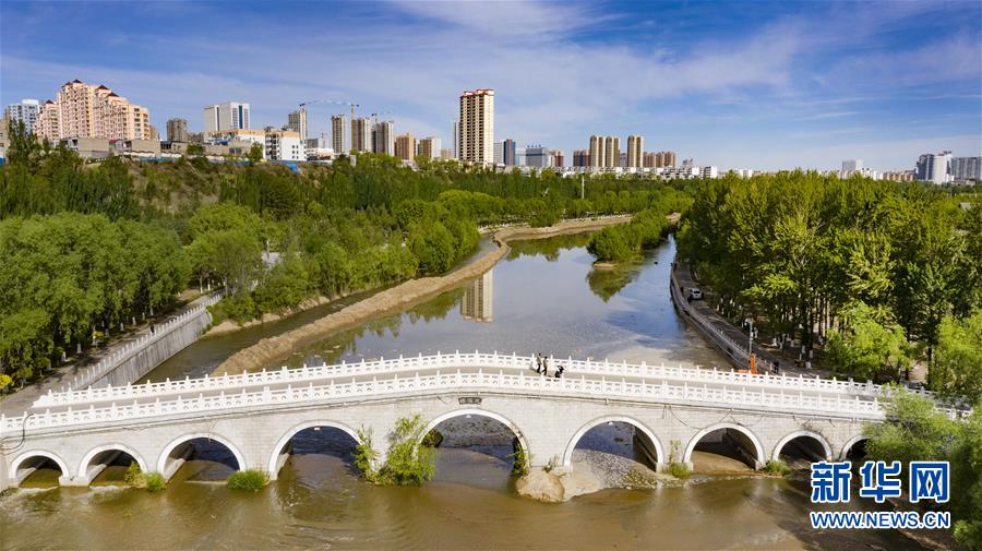 5月24日,市民在榆林市榆溪河生態(tài)長(zhǎng)廊休閑(無人機(jī)照片)。新華社記者陶明攝