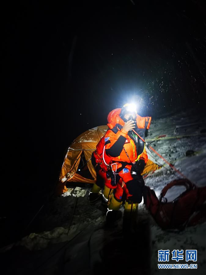 5月27日,在海拔5200米的珠峰大本營,2020珠峰高程測量登山隊總指揮、國家體育總局登山運動管理中心副主任王勇峰正在和位于海拔8300米突擊營地的測量登山隊隊員通話。新華社記者孫非攝