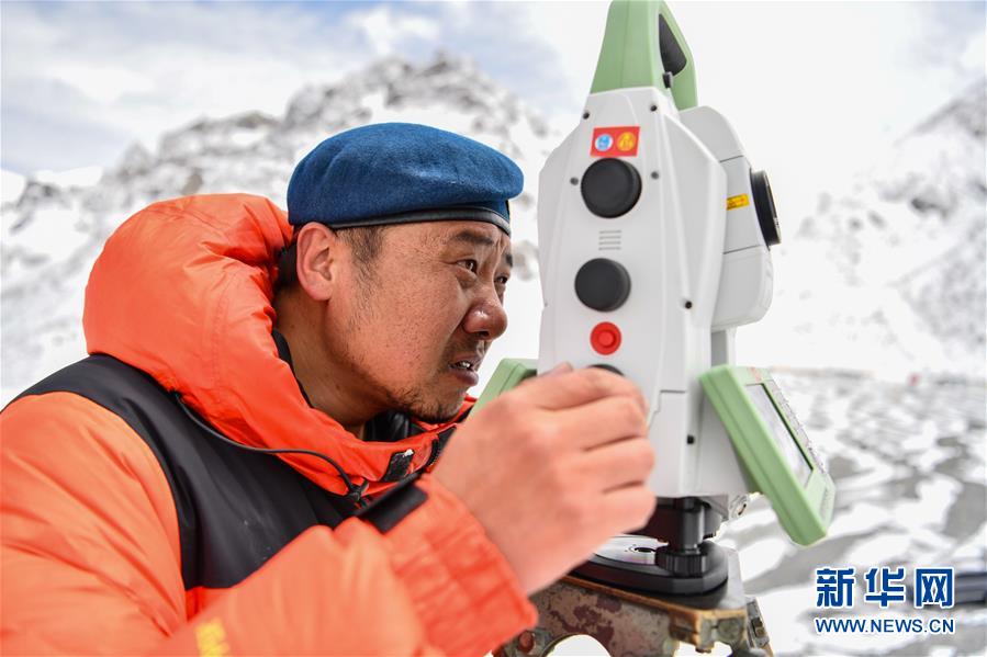 自然資源部第一大地測量隊(duì)隊(duì)員鄭林在使用全站儀對珠峰峰頂進(jìn)行交會(huì)觀測(5月27日攝)。新華社記者晉美多吉攝