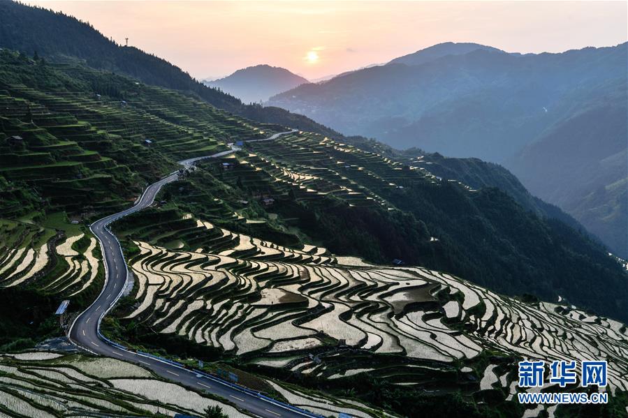 晨光中的從江縣加榜鄉(xiāng)加車梯田(5月28日攝)。夏日時節(jié),位于貴州省黔東南苗族侗族自治州從江縣加榜鄉(xiāng)加車、加頁、黨扭等苗寨的梯田在晨霧與陽光的映襯下線條分明,光影變幻,景色如畫。新華社記者 楊文斌 攝