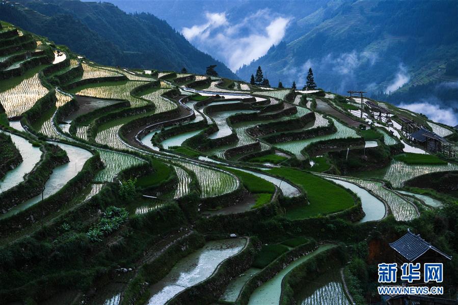 晨光中的從江縣加榜鄉(xiāng)加車梯田(5月28日攝)。夏日時(shí)節(jié),位于貴州省黔東南苗族侗族自治州從江縣加榜鄉(xiāng)加車、加頁、黨扭等苗寨的梯田在晨霧與陽光的映襯下線條分明,光影變幻,景色如畫。新華社記者 楊文斌 攝