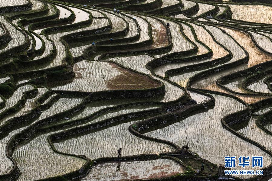晨光中的從江縣加榜鄉(xiāng)加車梯田(5月28日攝)。夏日時節(jié),位于貴州省黔東南苗族侗族自治州從江縣加榜鄉(xiāng)加車、加頁、黨扭等苗寨的梯田在晨霧與陽光的映襯下線條分明,光影變幻,景色如畫。新華社記者 楊文斌 攝