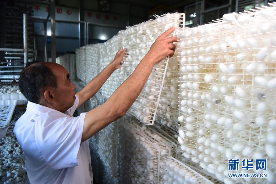 5月29日,奉節(jié)縣新民鎮(zhèn)中嶺村蠶桑產(chǎn)業(yè)扶貧基地工作人員在智慧蠶房?jī)?nèi)晾曬蠶繭。新華社記者 王全超 攝