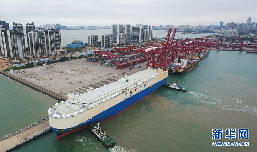 滾裝貨船“勞拉”輪駛?cè)牒?谛阌⒏?,這是海南自貿(mào)區(qū)政策實(shí)施以來(lái)的首艘汽車(chē)外貿(mào)船(2月16日攝,無(wú)人機(jī)照片)。新華社記者楊冠宇攝