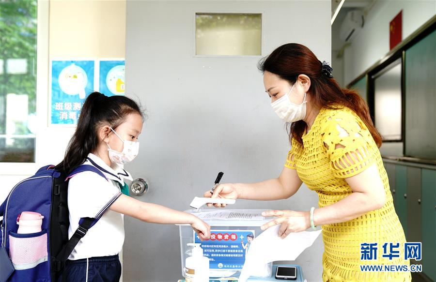 6月2日,上海閔行區(qū)鑫都小學(xué)的學(xué)生走進校園。當(dāng)日,上海小學(xué)一、二、三年級學(xué)生返校開學(xué)。新華社記者張建松攝。