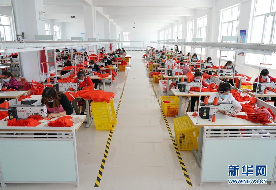 6月2日,工人在尚義縣大青溝鎮(zhèn)的易地扶貧搬遷集中安置小區(qū)附近一家扶貧工廠工作。