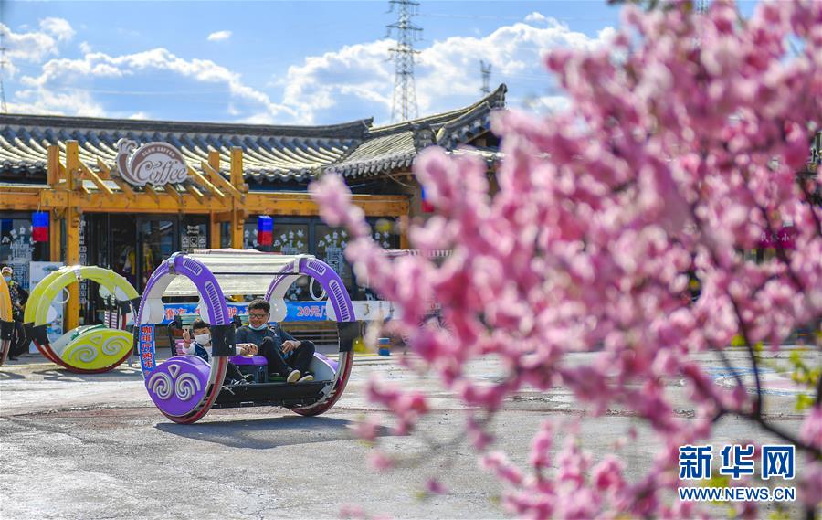 在延邊朝鮮族自治州和龍市“金達(dá)萊”民俗村,村民在村內(nèi)的咖啡館前體驗(yàn)親子游樂項(xiàng)目(5月6日攝)。新華社記者許暢攝。