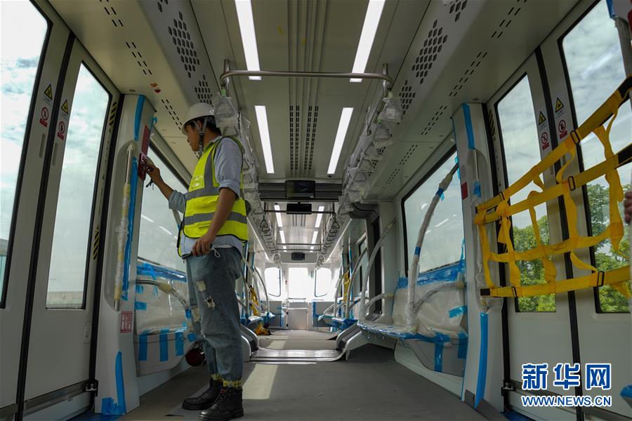 6月3日,工程技術(shù)人員在“云巴”車廂內(nèi)對(duì)自動(dòng)駕駛系統(tǒng)進(jìn)行調(diào)試。近日,重慶市首條“云巴”示范線項(xiàng)目在重慶璧山區(qū)正式亮相。此次發(fā)布的“云巴”采用電能驅(qū)動(dòng),具有轉(zhuǎn)彎半徑小、爬坡能力強(qiáng)、噪音低、安全性高、建設(shè)成本低、建造周期短等優(yōu)勢(shì),能為乘客提供更智能、舒適、便捷的出行體驗(yàn)。據(jù)介紹,璧山區(qū)“云巴”示范線項(xiàng)目自2019年8月開建,線路正線全長15.4km,共設(shè)車站15座,預(yù)計(jì)2020年9月全線通車。新華社記者劉潺攝。