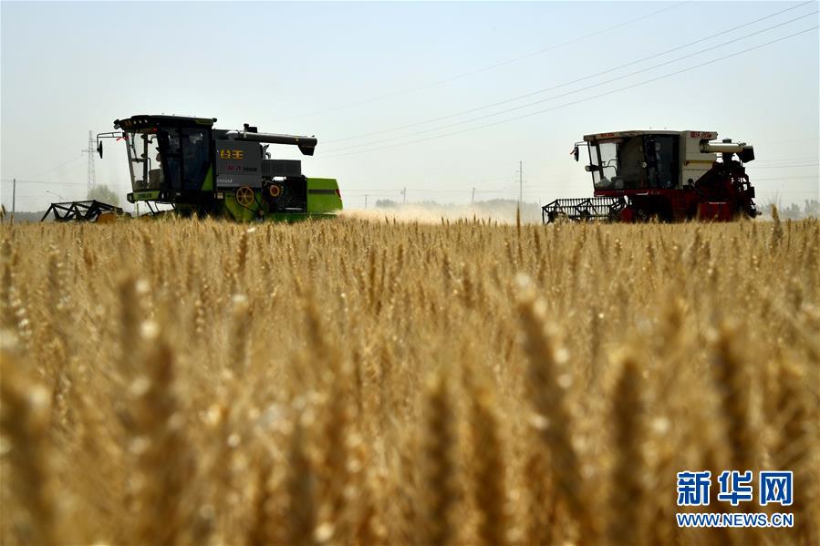 6月3日,收割機(jī)在汶上縣郭倉鎮(zhèn)的麥田里收獲小麥。目前,我國第二大小麥主產(chǎn)區(qū)山東6000多萬畝小麥進(jìn)入收獲階段。農(nóng)民們搶抓有利天氣,自南向北陸續(xù)開鐮。新華社記者郭緒雷攝。