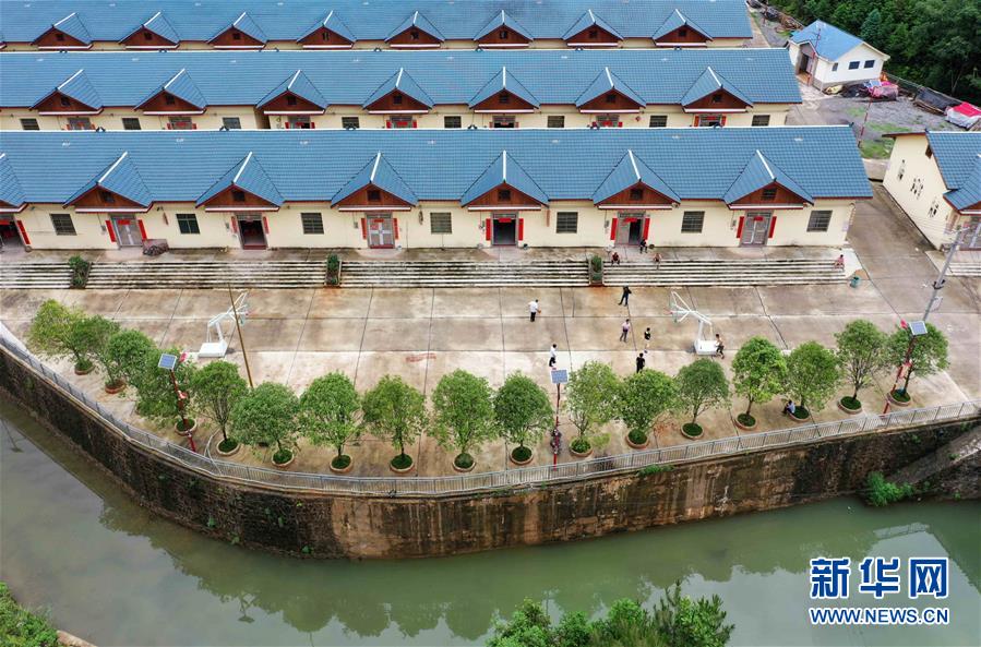 6月3日,人們在永州市新田縣兩江口村易地搬遷集中安置點打籃球(無人機照片)。新華社記者趙眾志攝。