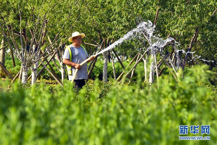6月5日,在文安縣迎賓大道,工人給花池澆水。近年來(lái),河北省文安縣將植樹(shù)造林與城市建設(shè)有機(jī)融合,探索“政府引導(dǎo)、企業(yè)運(yùn)作、多方共贏”的市場(chǎng)化植樹(shù)造林新模式,大規(guī)模推進(jìn)國(guó)土綠化,打造人與自然和諧共生的優(yōu)美生態(tài)環(huán)境,構(gòu)筑京津雄綠色屏障。截至目前,該縣森林覆蓋率已經(jīng)達(dá)到33%,城區(qū)綠地面積達(dá)到36.48%。新華社記者李曉果攝。