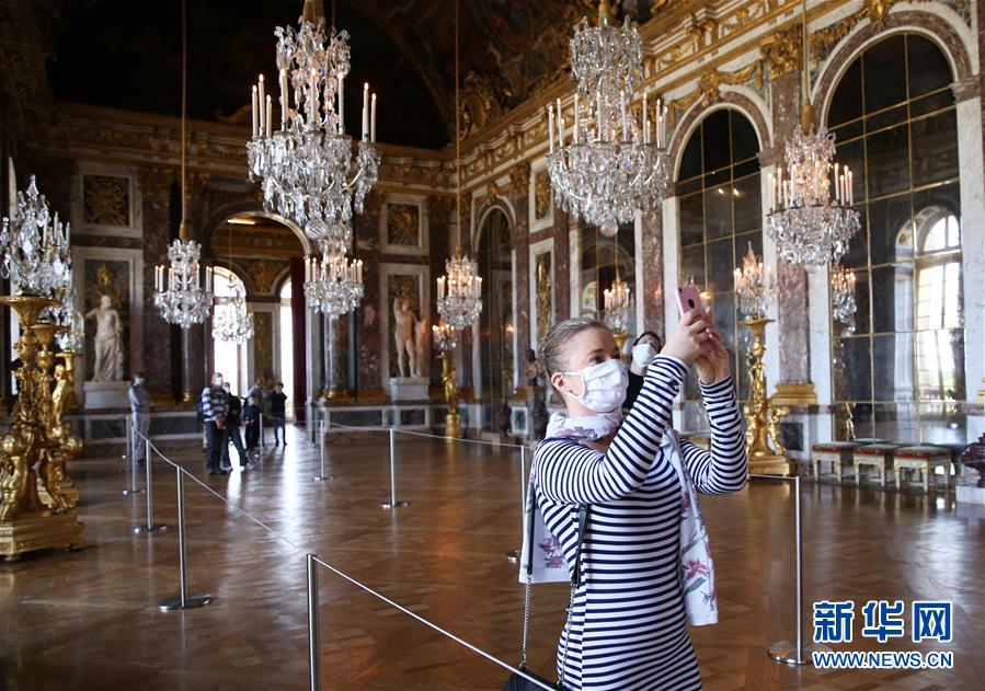 6月6日,一名游客戴著口罩在法國巴黎近郊凡爾賽宮的鏡廳內(nèi)參觀游覽。  新華社記者 高靜 攝