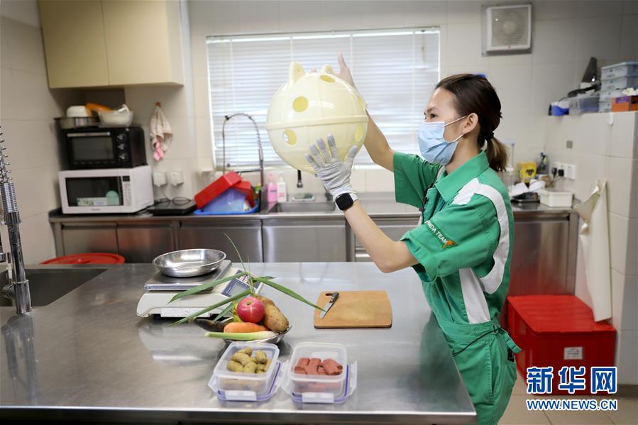 香港海洋公園陸生動(dòng)物部監(jiān)督殷漫萍在熊貓廚房介紹對(duì)熊貓的訓(xùn)練(5月11日攝)。新華社記者吳曉初攝