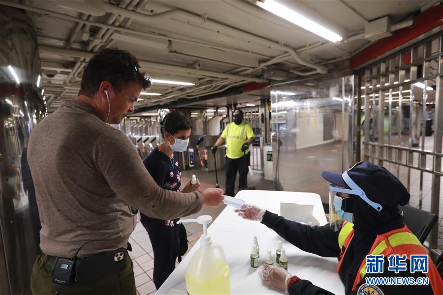 6月8日,在美國紐約,地鐵工作人員為乘客發(fā)放洗手液和口罩。在因新冠疫情進(jìn)入“居家令”近三個月之后,美國紐約市于當(dāng)?shù)貢r間8日開始“解封”,進(jìn)入經(jīng)濟(jì)重啟的第一階段。新華社記者王迎攝