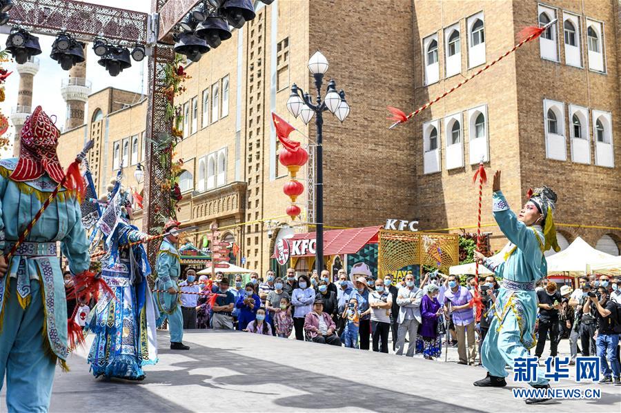 6月12日,在位于烏魯木齊大巴扎景區(qū)內(nèi)的活動(dòng)現(xiàn)場(chǎng),烏魯木齊秦劇團(tuán)的演員在表演國(guó)家級(jí)非物質(zhì)文化遺產(chǎn)——秦腔。6月12日,“文旅融合,文物賦彩,非遺傳承,健康生活”2020年烏魯木齊市天山區(qū)文化和自然遺產(chǎn)日推介展演活動(dòng)在大巴扎景區(qū)舉辦,吸引不少游客和市民觀賞。新華社記者王菲攝。