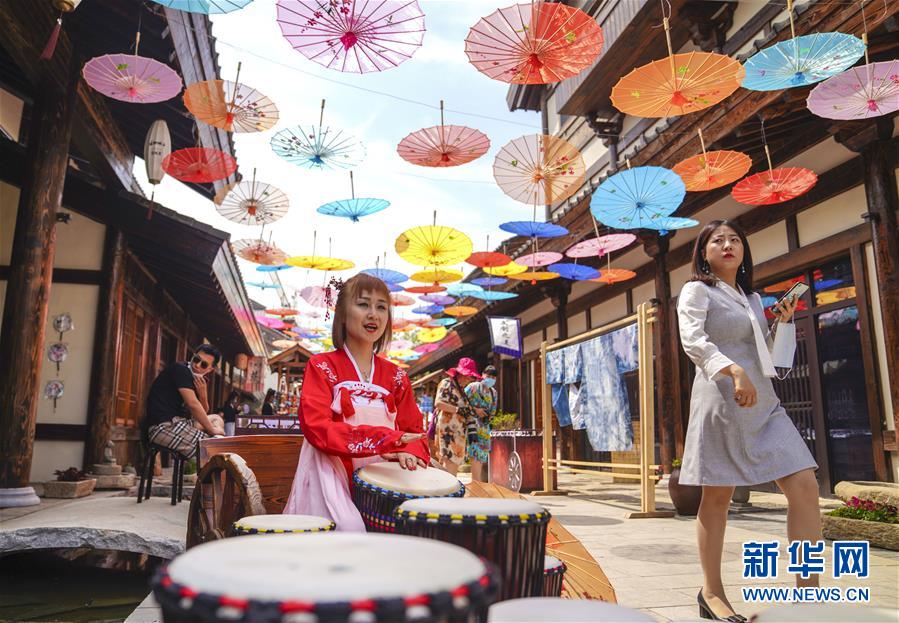 6月13日,在長春市世茂蓮花山小鎮(zhèn)寬厚里商街,表演者身穿漢服、古裝進行表演展示。當日是“文化和自然遺產(chǎn)日”。吉林長春首屆蓮花山消夏生活節(jié)在世茂蓮花山小鎮(zhèn)舉行?;顒訉⒎沁z展示與假日消暑休閑相結(jié)合,讓游人在“古色古香”的油紙傘巷中品傳統(tǒng)文化魅力,享夏日休閑愜意。新華社記者許暢攝。