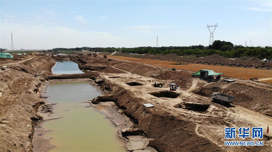 這是6月14日拍攝的山東小清河章丘段考古發(fā)掘現(xiàn)場(無人機照片)。近日,濟南市考古研究所考古工作隊在對小清河章丘段進行考古調(diào)查和勘探時,發(fā)現(xiàn)了13座年代集中在北朝末期至唐朝初期的古墓。新華社記者 王凱 攝