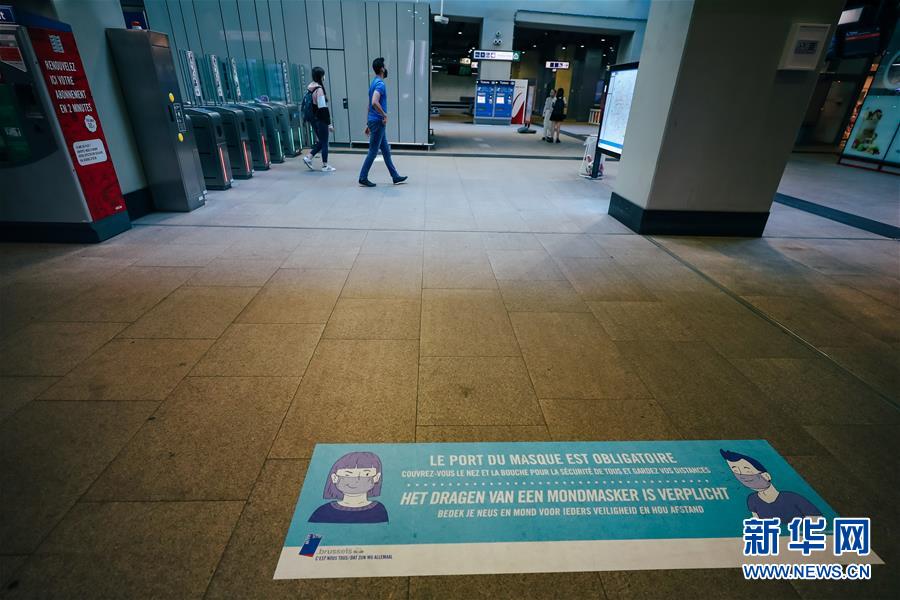 這是6月13日在比利時(shí)布魯塞爾一處地鐵站拍攝的提醒乘客佩戴口罩的提示牌。新華社記者 張鋮 攝