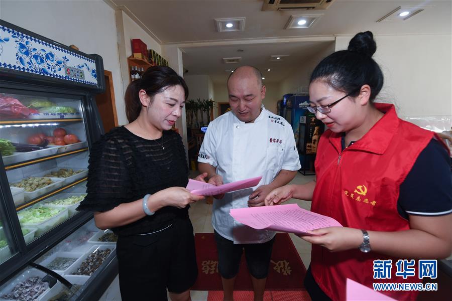 6月17日,黨員志愿者(右)在東林鎮(zhèn)一家農(nóng)家樂內(nèi)給經(jīng)營戶發(fā)放野生動物保護及禁食倡議書。新華社記者 徐昱 攝