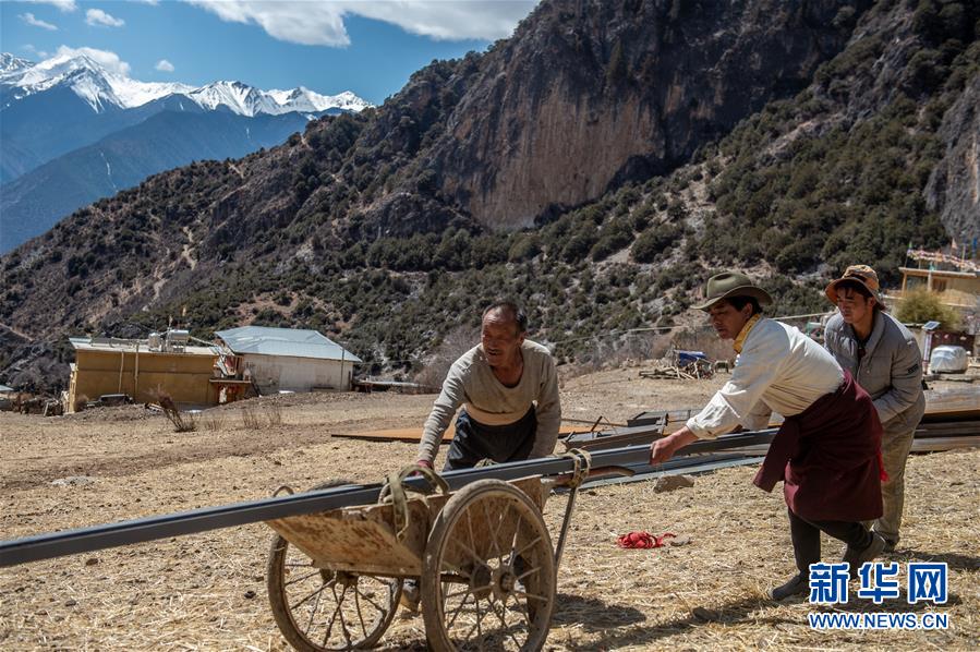 德欽縣佛山鄉(xiāng)江坡村說打村村民斯那定主(中)和村民一起搬運建筑材料(3月14日攝)。新華社記者 胡超 攝