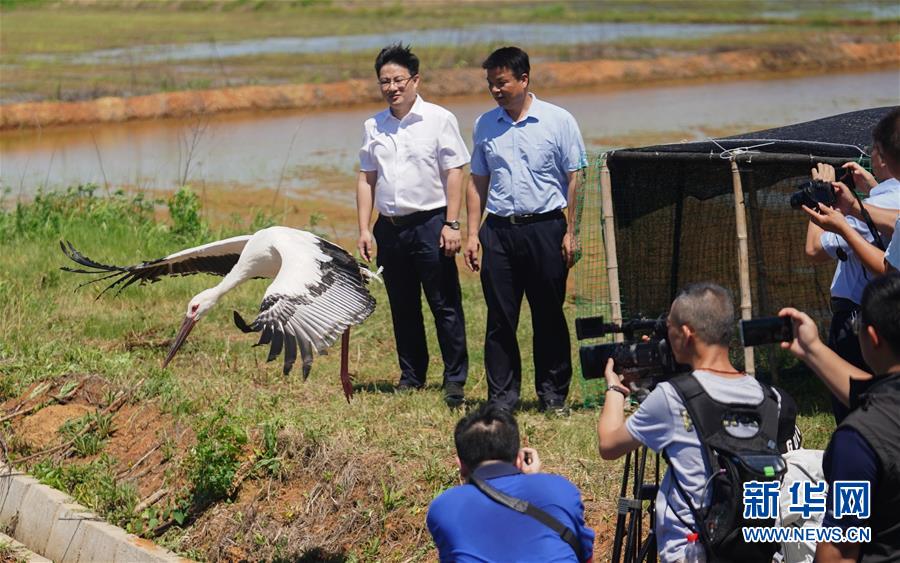當日,江西省林科院野生動植物救護中心在萬年縣鄱陽湖畔放飛三只被救助的東方白鸛。