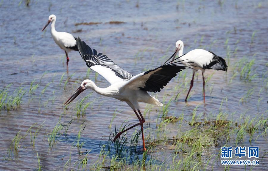 6月17日,放歸自然的三只東方白鸛在覓食。新華社記者 周密 攝