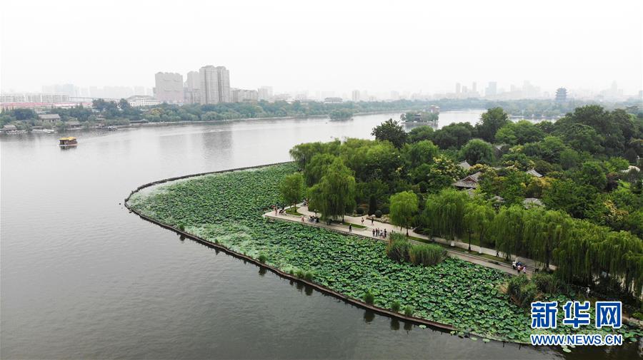 6月19日拍攝的大明湖畔的荷花池(無(wú)人機(jī)照片)。近日,山東濟(jì)南大明湖的荷花陸續(xù)綻放,吸引游客前來(lái)觀賞。新華社記者 王凱 攝