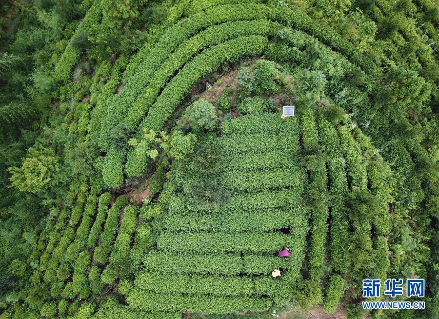 蔡齊艷和爸爸蔡守偉在自家茶園里拔草(6月20日無人機(jī)照片)。新華社記者張端攝
