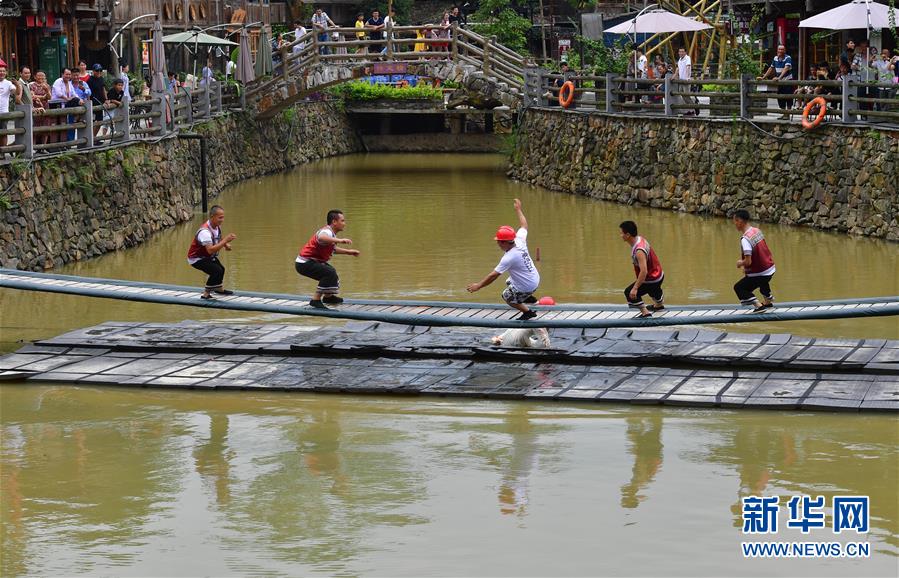 在廣西融水雙龍溝森林旅游度假區(qū)夢(mèng)嗚苗寨,幾位搬遷戶協(xié)助游客挑戰(zhàn)“搖擺橋”(6月21日攝)。近年來(lái),融水打造原生態(tài)苗族文化體驗(yàn)園——夢(mèng)嗚苗寨,讓搬遷進(jìn)城的貧困戶住進(jìn)復(fù)原建設(shè)的老房子。景區(qū)提供綠化保潔、游樂設(shè)施管理、民族歌舞表演等工作崗位,多渠道增加貧困戶收入。新華社記者黃孝邦攝