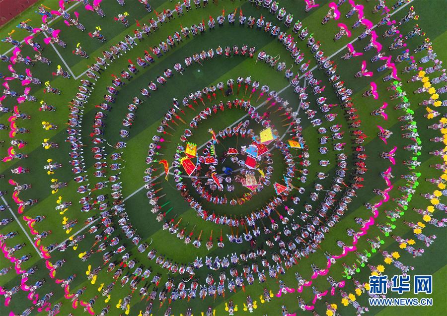 在廣西融水苗族自治縣民族體育公園,當(dāng)?shù)厝罕娫谔J笙斗馬節(jié)開幕式上表演歌舞(無(wú)人機(jī)照片,2017年11月18日攝)。新華社記者黃孝邦攝